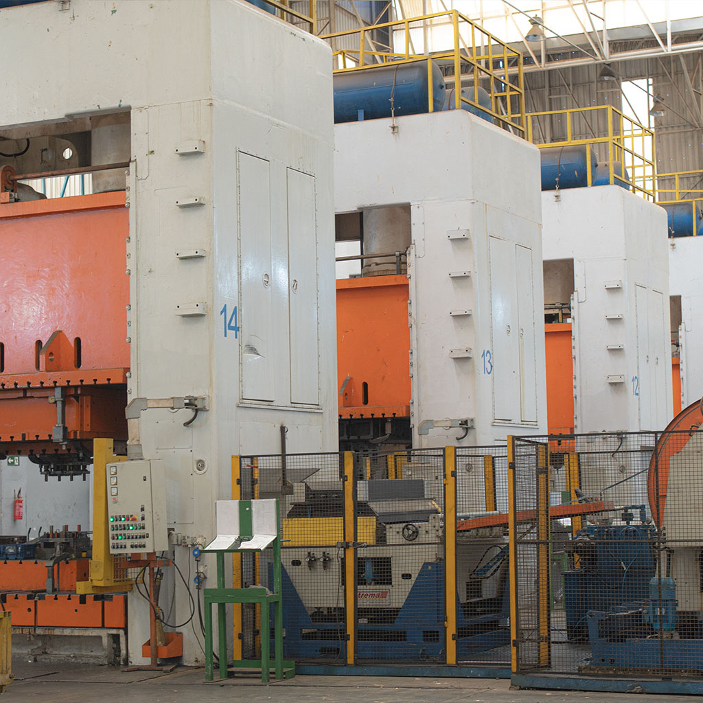 Linhas com prensas de alta tonelagem e alimentação automatizada asseguram repetibilidade e controle de processo. Desbobinadores e mesas dimensionadas para grandes formatos, com inspeção em linha quando requerido.
